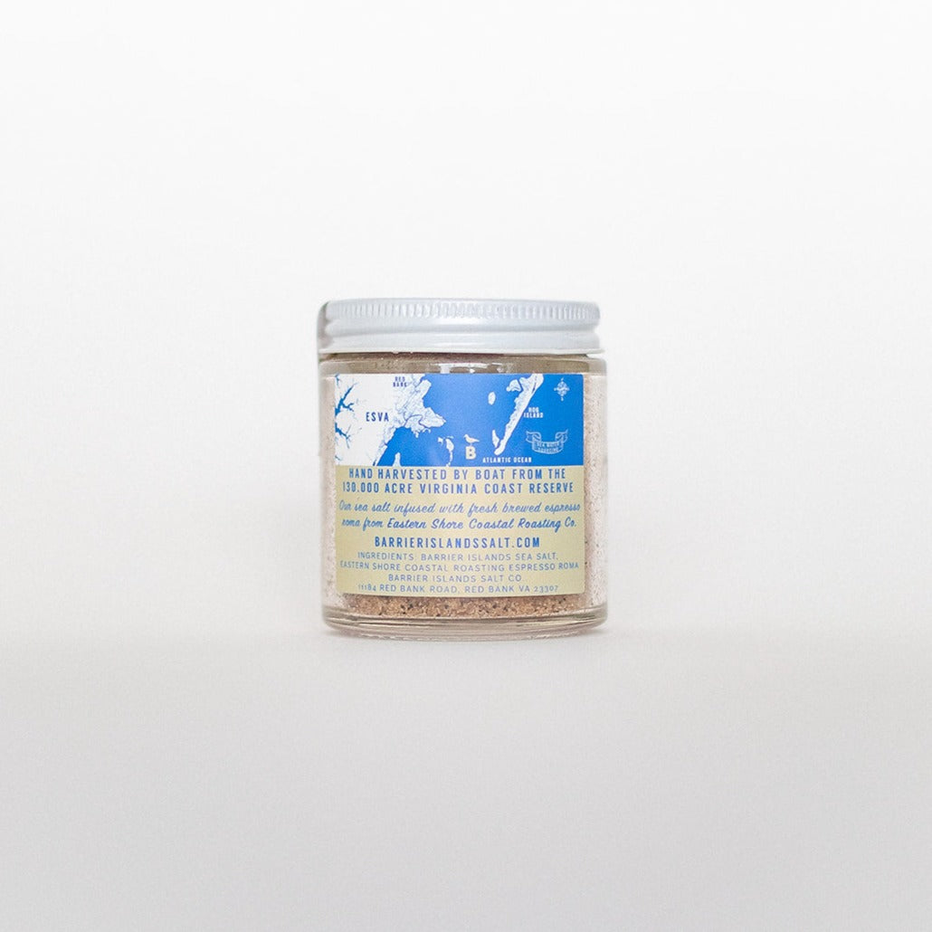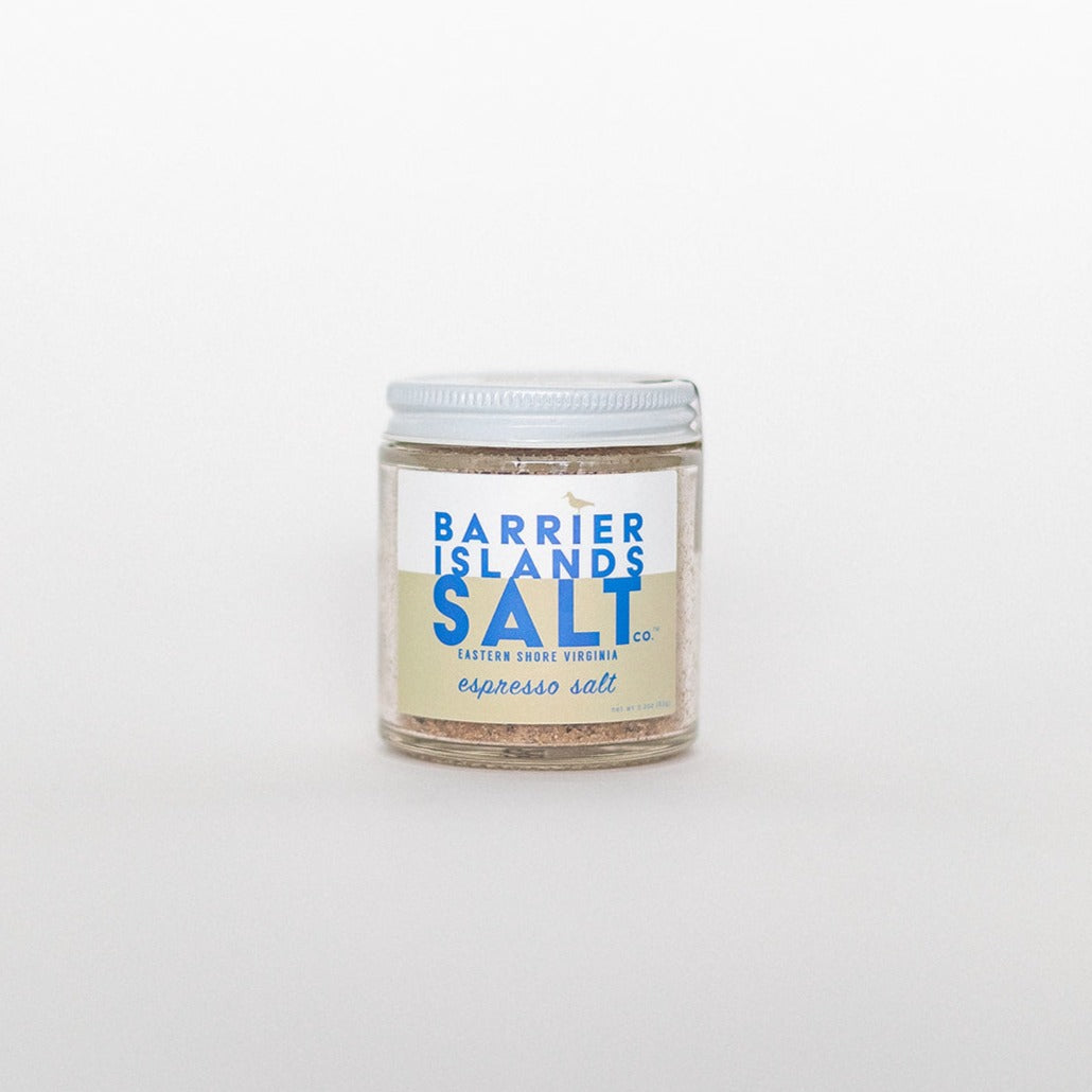 We infused our Barrier Islands Sea Salt with freshly brewed Espresso Roma locally roasted by Eastern Shore Coastal Roasting Co. We use a two step process, first infusing the salt flakes, then mixing in finely ground coffee to create a rich, deeply flavored salt that's perfect on chicken, beef, chocolate desserts or the rim of your favorite martini.